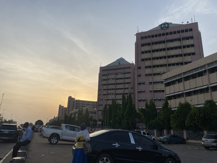 - "The image displays an outdoor scene at the Federal Secretariat complex in Abuja, Nigeria, during either sunrise or sunset, characterized by a sky transitioning from a warm orange-yellow on the horizon to light blue overhead" by FM-hAJdt1, licensed under CC BY 4.0