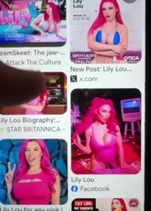 smartphone screen displaying a Google image search for "Lily Lou". The search results show various images of a woman with bright pink hair, often wearing revealing clothing. A finger is seen tapping the screen, presumably navigating through the search results. The overall environment is a digital space within the smartphone, focused on the visual presentation of the search results.