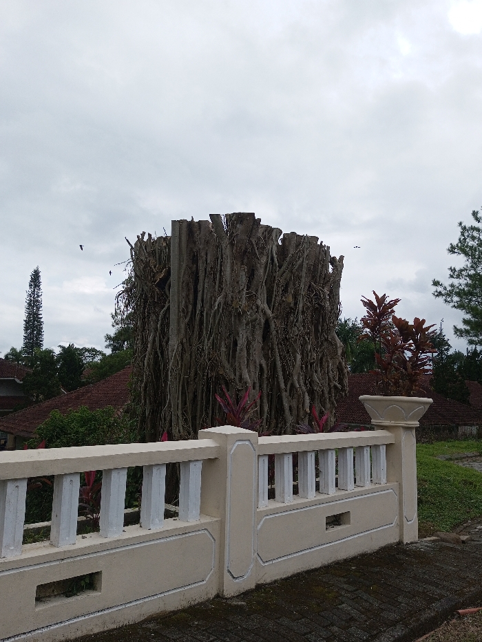 A gray, overcast day frames a unique sight: a thick, roughly cylindrical structure composed of intertwining roots and stumps. The roots are light brown and dense, resembling a massive, gnarled bush. In the background are tiled rooftops and distant trees. A low, beige concrete fence with white balusters runs across the foreground. To the right of the structure is a potted plant with maroon leaves. The ground is paved with dark gray bricks. Several birds are scattered in the sky.