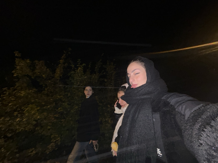 The image displays three individuals outdoors at night. In the foreground on the right, a female is visible in a close-up, wearing a dark hooded garment and a thick dark scarf, with her tongue slightly extended. Her right arm is extended, suggesting she is holding the camera for a selfie. Behind her, partially obscured, is another female with dark hair, wearing a lighter-colored top, with her left hand near her ear, possibly holding a mobile phone. Further in the background on the left, a third female with dark hair, wearing a dark long-sleeved top and light-colored jeans, stands facing the camera with a neutral expression, holding a pair of sunglasses in her right hand. The environment consists of dark foliage, likely trees or bushes, dimly lit from an unseen source, forming the background. The sky above is dark, with a horizontal light streak visible in the upper right quadrant. No specific architectural or geographical landmarks are visible to confirm the location in Strasbourg, France.