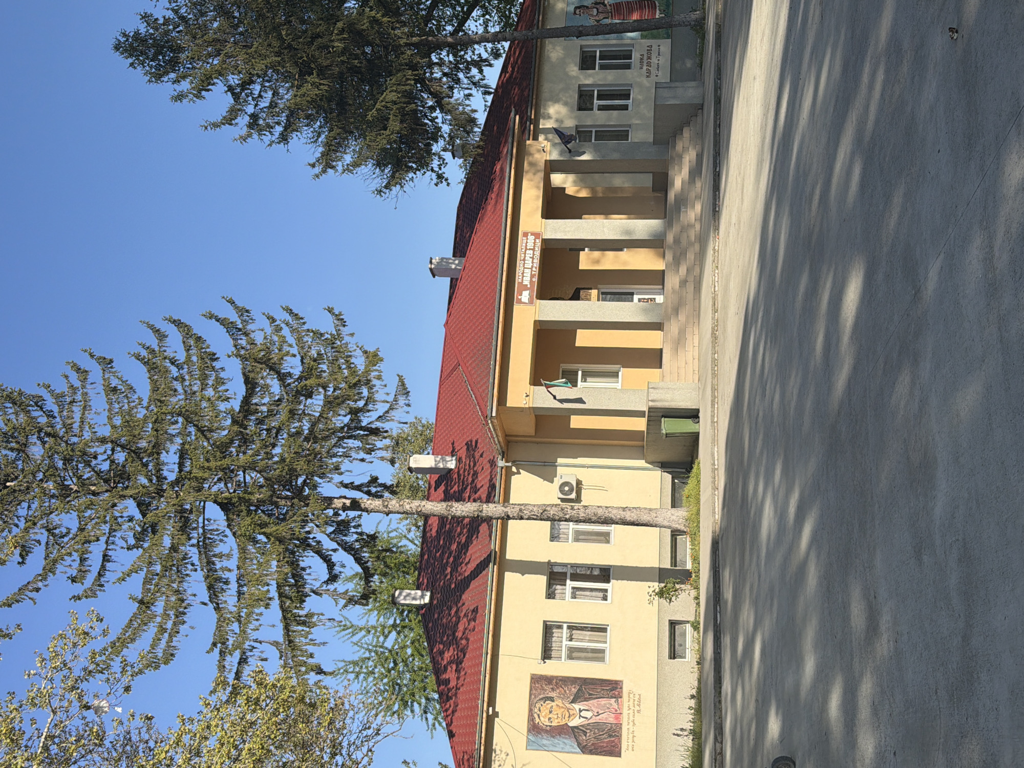 Narodno Chitalishte "Ivan Tsarev 1906" community center located in the village of Trivoditsi, Bulgaria. The building is a two-story structure with a red roof and yellow walls. It features a row of columns at the entrance and murals on the exterior walls. The murals depict figures and possibly reflect local culture or history. The surrounding environment includes trees casting shadows on the pavement in front of the building and a clear blue sky in the background.