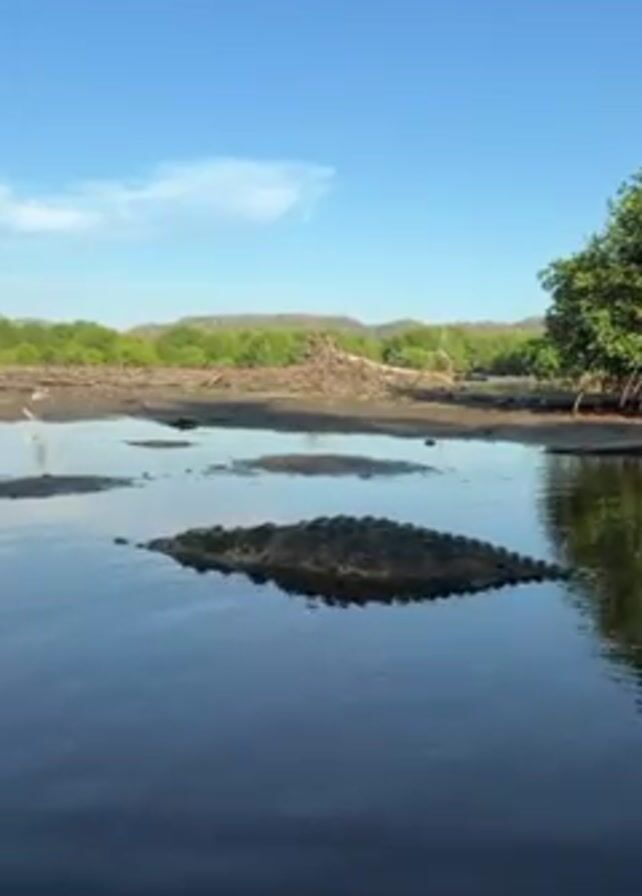 The video depicts a body of water with a crocodile lying semi-submerged in the foreground