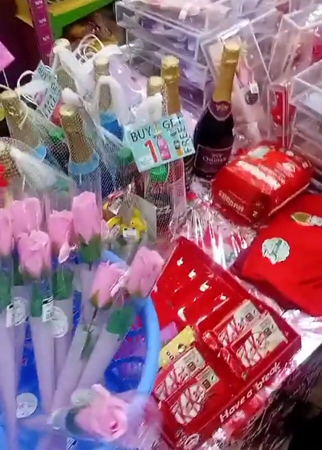 table displaying gift items for sale. These include pink rose pens in a blue basket, multiple mini bottles of sparkling wine, several boxes of Kit Kat bars arranged in a red tray, a package of Huggies diapers, a small red shirt with an image, and several transparent plastic boxes containing assorted gifts. A sign reading "BUY 1 GET 1 FREE" can be seen in front of the sparkling wine bottles. The overall arrangement suggests a store display of baby shower or celebratory gifts. The camera seems to be held by a person who briefly passes the scene.