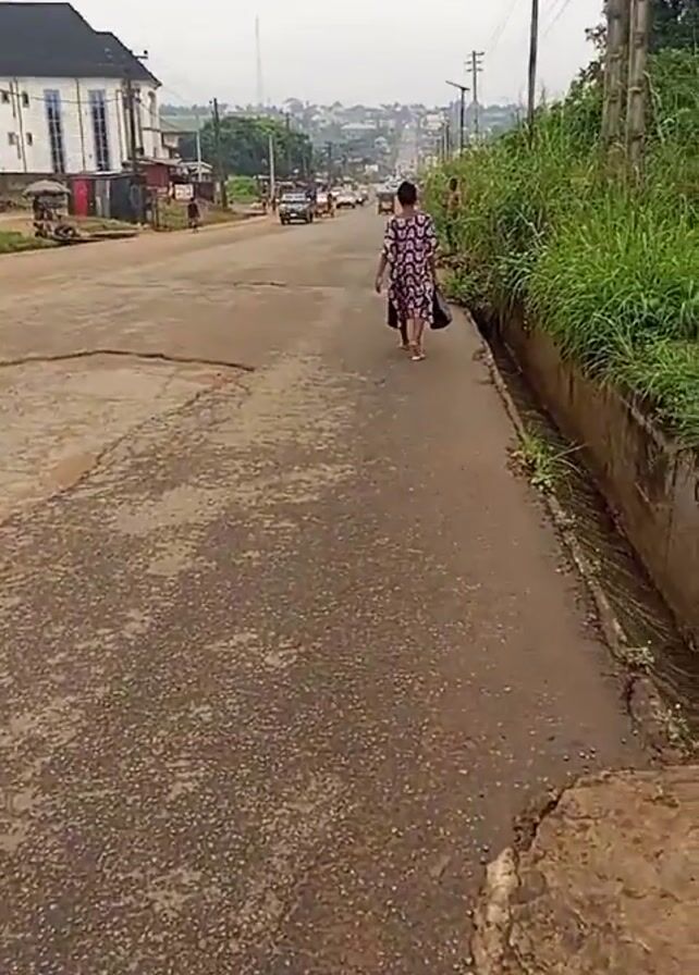 street scene on what appears to be a cloudy day. The road is cracked and shows signs of wear. A woman in a patterned dress is walking away from the camera down the side of the road. She is carrying a dark-colored bag. Across the street, there is a multi-story building. There are a few vehicles driving on the road. On the right side of the road is a grassy bank and some utility poles. In the distance, the skyline of a town can be seen. The overall scene suggests a typical day in a residential or commercial area.