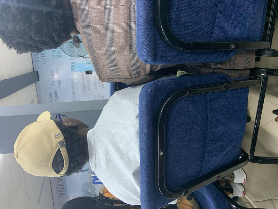 This image captures an indoor scene in Idimu, Nigeria, viewed from behind two seated individuals