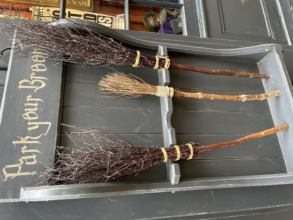 Three handcrafted brooms, dark brown and straw-colored, sit in a dark gray wooden tray with the inscription "Park your Broom