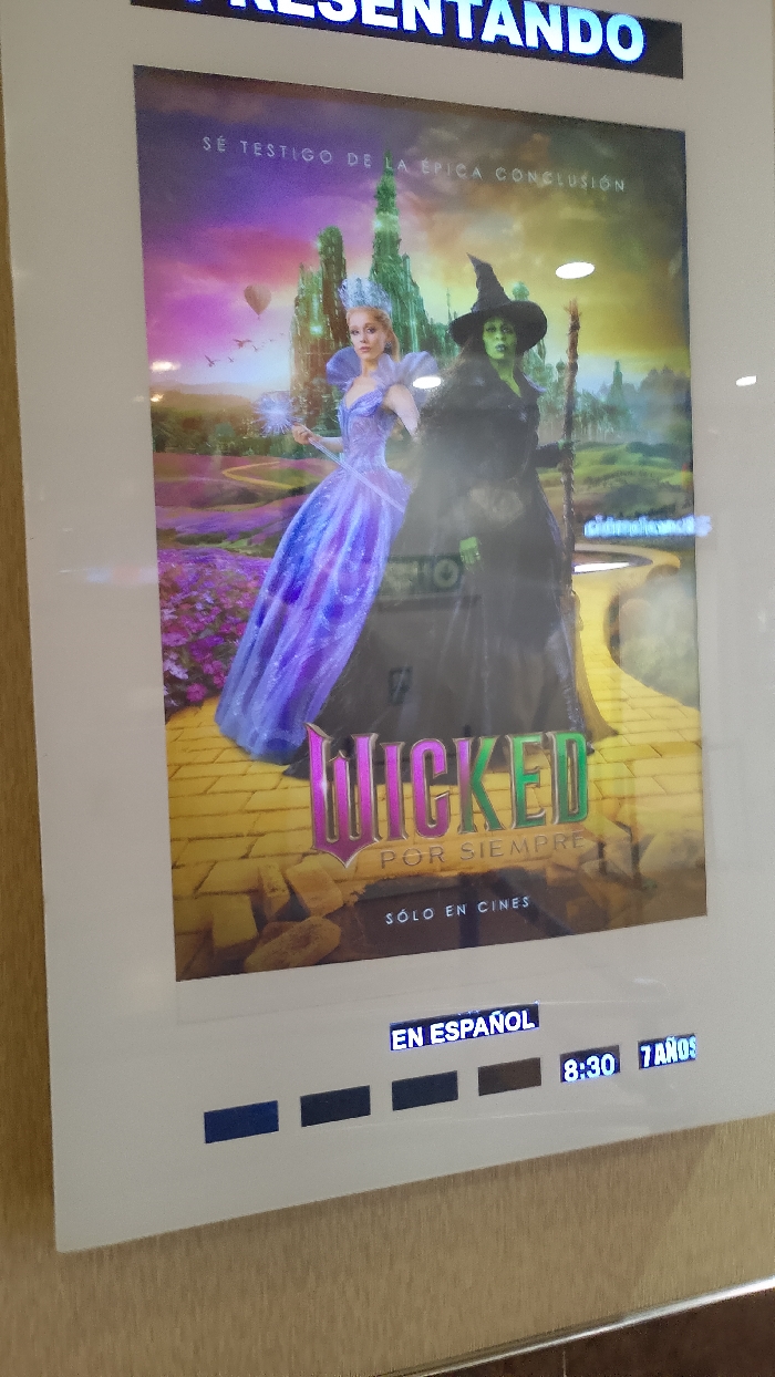 A movie poster advertises "Wicked," with the tagline "Por Siempre" and "Sólo en cines