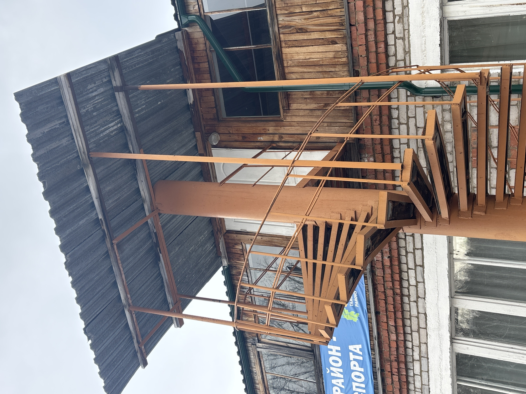This forensic description details a two-story building exterior in Akul'shet, Russia, captured under an overcast sky. A prominent orange-painted metal spiral staircase serves as the primary access to the upper floor. The lower level of the building features alternating courses of red and white brickwork, with large multi-pane windows framed in white. Above these windows, a large blue banner, partially visible, displays white Cyrillic text, including "РАЙОН - СПОРТА" and "ТАЙ РАЙОНУ," suggesting a connection to a district or sports. The upper story is constructed with vertical wooden plank siding, which appears weathered. This level includes multiple multi-pane windows with dark frames and a white entrance door, above which a white wall-mounted light fixture is visible. A corrugated metal roof overhang, supported by several slender orange metal posts, extends from the upper facade, providing cover for the top of the staircase and the entrance. A dark green downspout runs vertically along the right side of the spiral staircase. No individuals or active interactions are present in the scene.