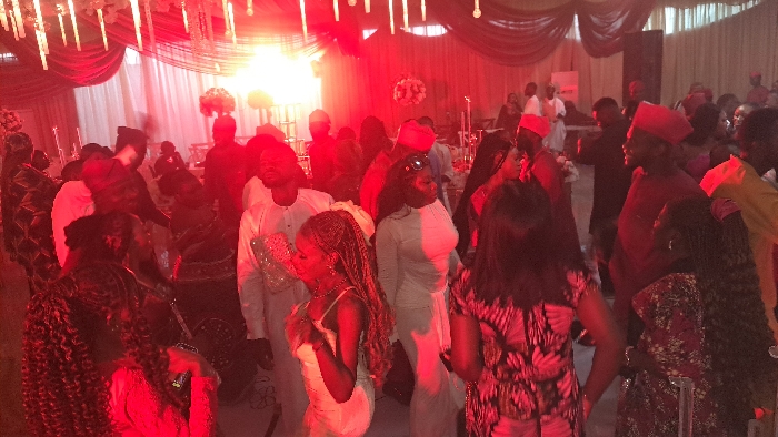 A crowded indoor event with many people in varying attire. Red lighting and decorative elements hang from the ceiling. Some individuals are in white outfits, while others wear traditional clothing with red hats. Most are standing and appear to be mingling. A stage can be seen in the background, suggesting a formal event.