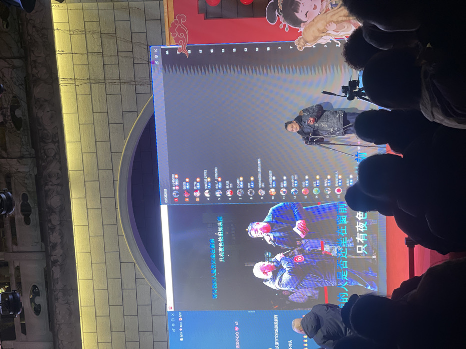 This image depicts an indoor event taking place in Bishan, China. The focal point is a large LED screen displaying a live performance and interactive content to an audience. On the screen, two adult men are shown on a red-lit stage, each holding a microphone, suggesting they are singing or speaking. The man on the left has light skin, is balding, and wears a dark puffer jacket. The man on the right is heavier set, has dark hair, and wears a dark coat. Overlaid on this video feed are Chinese characters, likely song lyrics or captions. To the right of the performance video, a vertical list displays numerous entries with Chinese names, small icons (such as hearts and flames), and numbers, indicating a live stream chat or interaction feed. The screen also features a decorative red banner with a stylized cloud and a cartoon character holding a large ginseng root on its far right edge. The screen itself is operating a computer interface, evidenced by window controls in the top right corner. In the real-world foreground, a man with dark hair tied back, wearing a camouflage jacket, stands to the right of the screen, operating a video camera mounted on a black tripod. Another tripod-mounted camera is visible further to his right. The immediate foreground is filled with the dark silhouettes of numerous audience members, whose backs of heads are visible, indicating they are facing the screen. The background consists of a light-colored brick wall with an arched architectural detail above the screen. A bright yellow strip light runs horizontally along the top of the brickwork. Overhead, several dark stage lights are mounted. The overall lighting is dim, with the screen providing the primary illumination for the front area.