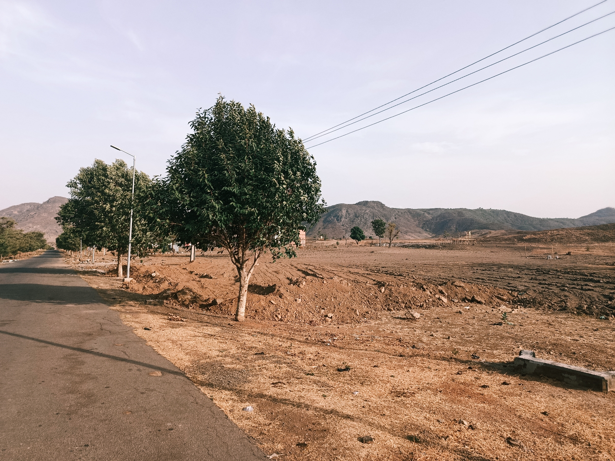 rural scene in Rafin Pa, Nigeria. A paved road runs along the left side of the frame, bordered by a row of trees and a lamp post. The trees have green foliage, and their trunks are light in color. Beyond the trees, the landscape transitions to a dry, cultivated field. The soil is a mix of brown and red hues, with visible tilling marks. In the distance, rolling hills are visible against a pale sky. Overhead, electrical wires stretch across the sky. A concrete block sits on the ground to the right of the frame. There are no people visible in the image.