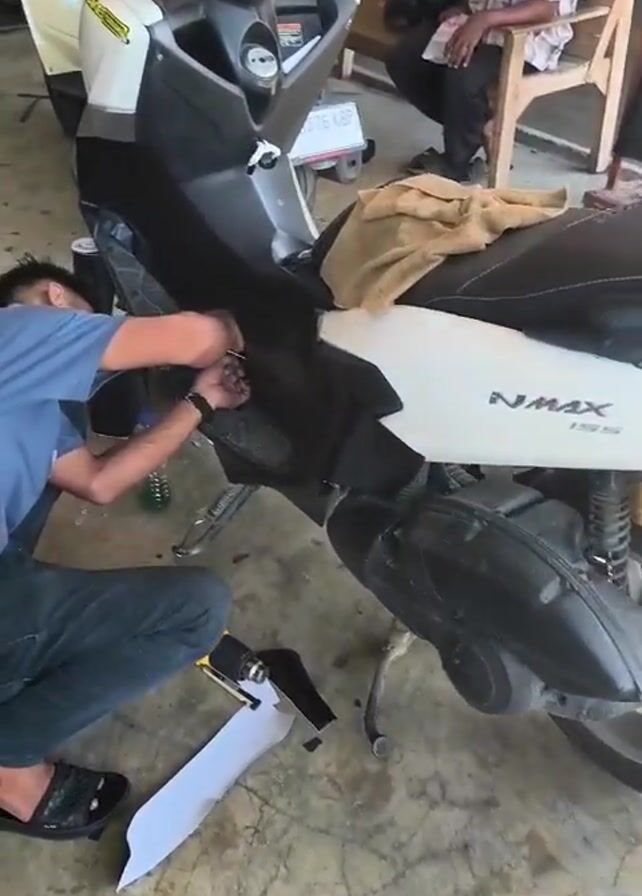 A man is wrapping a black vinyl adhesive around a white motorcycle, making sure to smooth out any creases or bubbles with a small yellow tool. He is kneeling on the ground wearing jeans, a blue shirt, and slides. There is a heat gun near him on the floor. The motorcycle has the word "NMAX" written on it in white lettering. Another man is seated on a wooden bench in the background. The floor is a stained concrete.