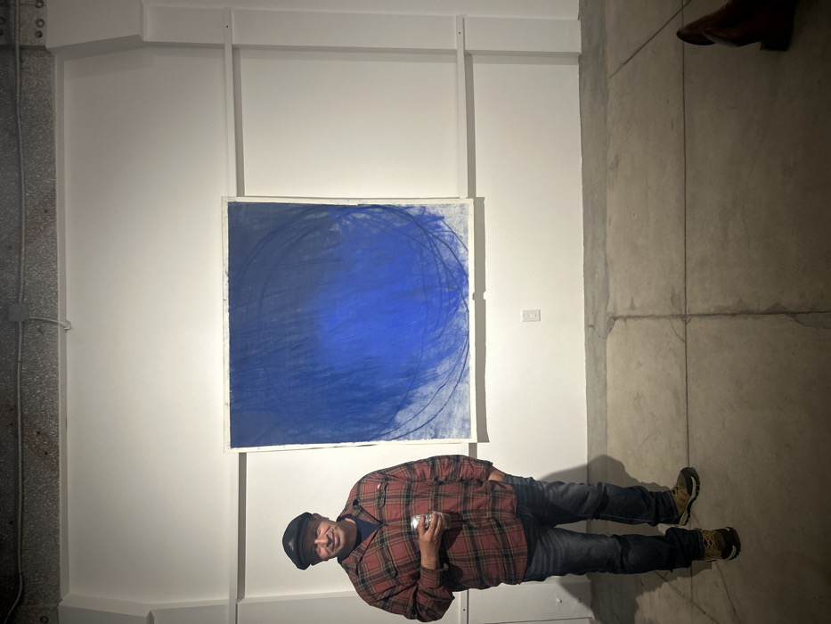 A man in a plaid shirt, jeans, and a cap stands in front of a large, square painting with a bold blue circular design. The painting hangs on a white wall with visible framing elements. The setting appears to be an art gallery or exhibition space. The floor is concrete with visible seams. The man holds a small, reflective object in his hand. The photo has a slightly tilted perspective.