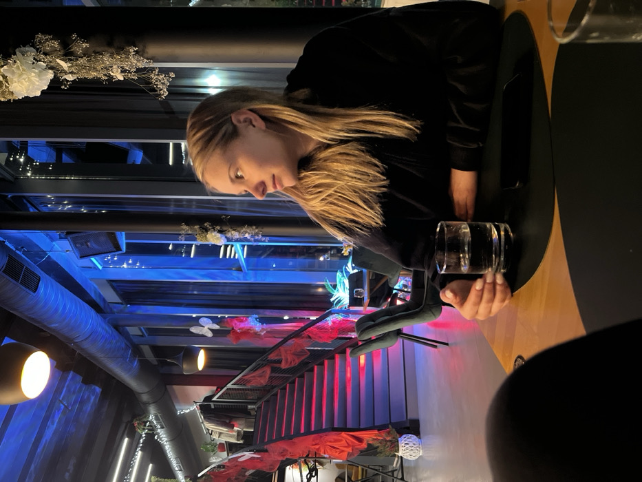 The scene is an interior view of Sky Bar & Restaurant, located in Bratislava, Slovakia. A blonde-haired female is seated in profile at a light-colored wooden table in the foreground, facing towards the right. She holds a clear glass containing water in her left hand, while her right forearm rests on the table. A dark-colored smartphone lies flat on a black circular placemat to her right. In the mid-ground to the left, a prominent metal staircase with integrated red lighting illuminates each step. The staircase railing is draped with red translucent fabric and features white artificial butterfly adornments. Garments are visible hanging near the upper section of the staircase. Further into the background, large floor-to-ceiling windows display a cool blue ambient light, suggesting an external nighttime view or deliberate internal lighting. The ceiling features exposed dark ventilation ducts and multiple warm yellow pendant light fixtures. String lights are strung along the ceiling and ducts. Dried white floral arrangements are suspended from the ceiling and attached to vertical columns. Dark upholstered chairs with black legs are visible in various positions within the mid-ground. A white decorative, lattice-patterned planter is situated on the floor near the base of the staircase. The overall environment is dimly lit with a combination of red, blue, and warm yellow artificial light sources.