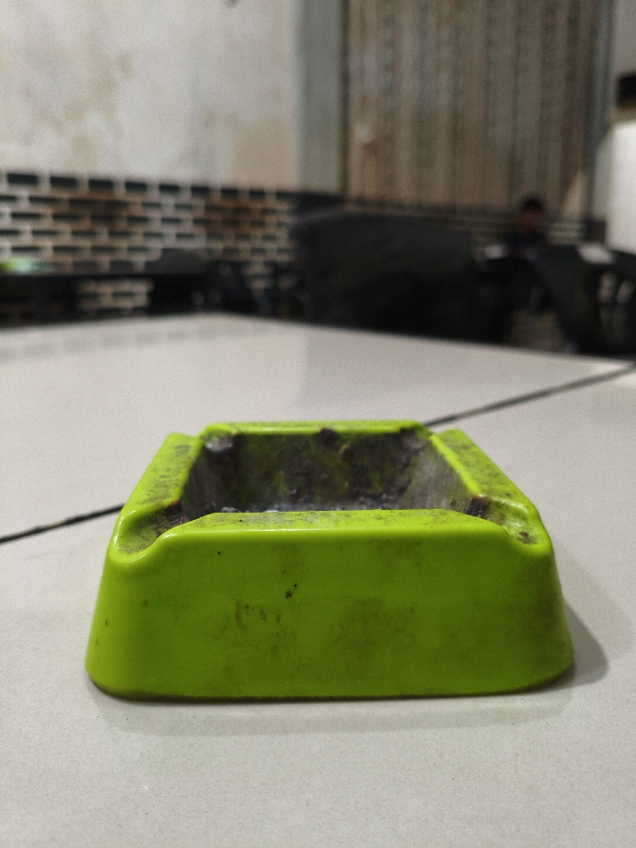 A neon green, square-shaped plastic ashtray, visibly containing dark ash and cigarette remnants, rests centrally on a light-colored tiled surface. The ashtray has four U-shaped indentations on its rim and displays surface grime. A thin, dark line, possibly a grout line or cable, traverses the tiled surface diagonally from the lower left to the upper right, passing behind the ashtray. The background is significantly blurred, revealing a wall adorned with a horizontal pattern of small, dark, rectangular bricks or tiles. Beyond the wall, a dark, indistinct human figure is discernible seated in the distance, alongside other blurred objects. The scene is located in Mns Alue, Indonesia.