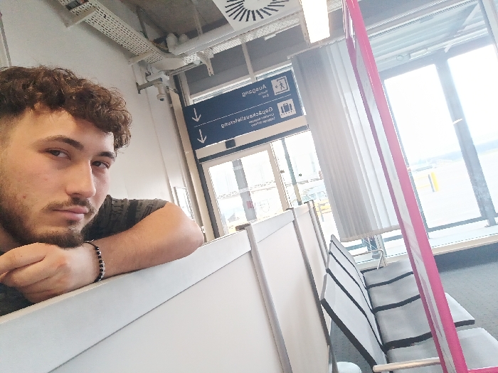 A male individual is captured in a close-up, selfie-style photograph within an indoor airport terminal, specifically identified as the German sector of EuroAirport Basel Mulhouse Freiburg, located in Saint-Louis, France