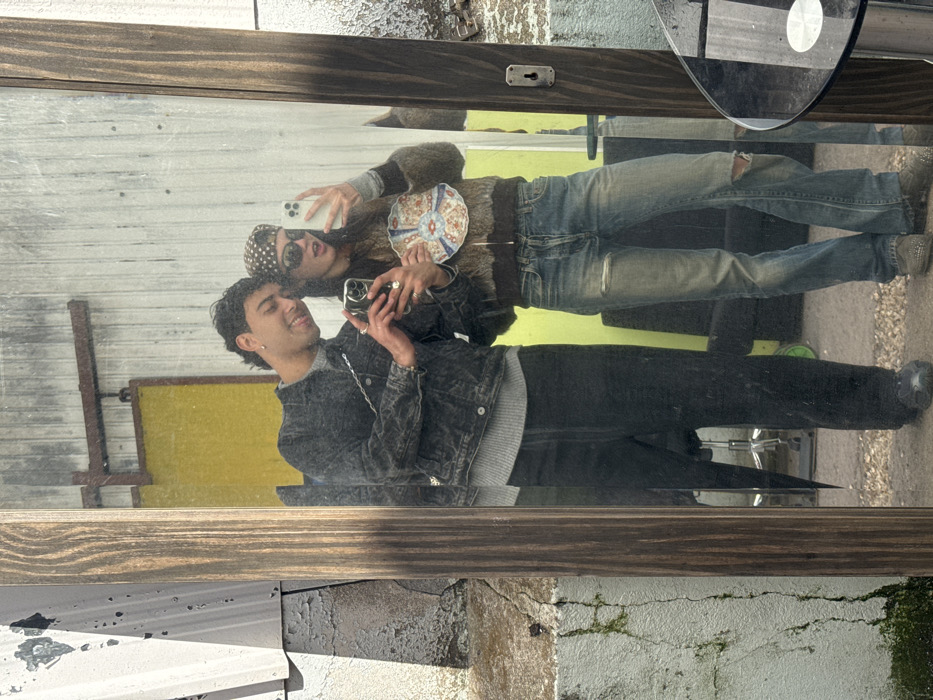 The image displays an outdoor mirror selfie featuring two young individuals in Neuilly-Plaisance, France, against a backdrop indicative of an urban industrial or salvage environment. The male subject, positioned on the left, has dark, curly hair and wears a dark acid-wash denim jacket over a light grey crew-neck sweater, dark trousers, and dark shoes. He holds a dark-colored smartphone with both hands, positioned to photograph the reflection, and exhibits a smiling expression with his head tilted towards the female. Multiple rings are visible on his left hand, and a silver chain hangs from his jacket. The female subject, on the right, has dark hair partially obscured by a dark, polka-dot bandana and dark sunglasses. She wears a brown textured bomber jacket over a light grey long-sleeved top, distressed blue jeans with tears at the knees, and light-colored shoes. She holds a light-colored smartphone in her left hand, also aimed at the reflection, and a circular, multicolored ceramic plate with her right hand. Her mouth is open in what appears to be a smile behind the sunglasses. Multiple rings are visible on her right hand. The full-length, vertically oriented mirror is encased in a distressed wooden frame, featuring a keyhole plate on its right vertical side. The reflective surface exhibits minor imperfections. The background visible within the mirror's reflection includes a bright yellow wall or structure, metallic beams, and indistinct forms suggesting outdoor furniture, all resting on an asphalt or concrete surface. Outside the mirror frame, to the left, a weathered corrugated metal wall is present above a cracked concrete wall with green moss growth. To the right, a portion of a round table with a glass top and metallic base is visible in the foreground.