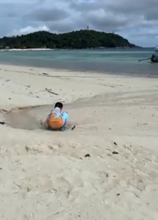 child sitting on a sandy beach, playing in the sand. The child is wearing a brightly colored orange and blue outfit. The child is positioned in the foreground, digging or patting the sand. The sand is light in color and appears soft. The background features a calm, turquoise sea and a small, green island. There are a few boats visible in the water. The sky is overcast with scattered clouds, but there are patches of blue sky visible. The overall scene suggests a peaceful beach setting.