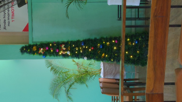 A Christmas garland decorated with colorful balls, ribbons, and lights hangs horizontally against a light green wall. Below the garland, a potted plant with green palm-like leaves is visible. To the right, a wooden structure with vertical and horizontal beams is partially in view, suggesting a shelf or display. A sign with text in an unfamiliar language is partially visible in the upper left corner.