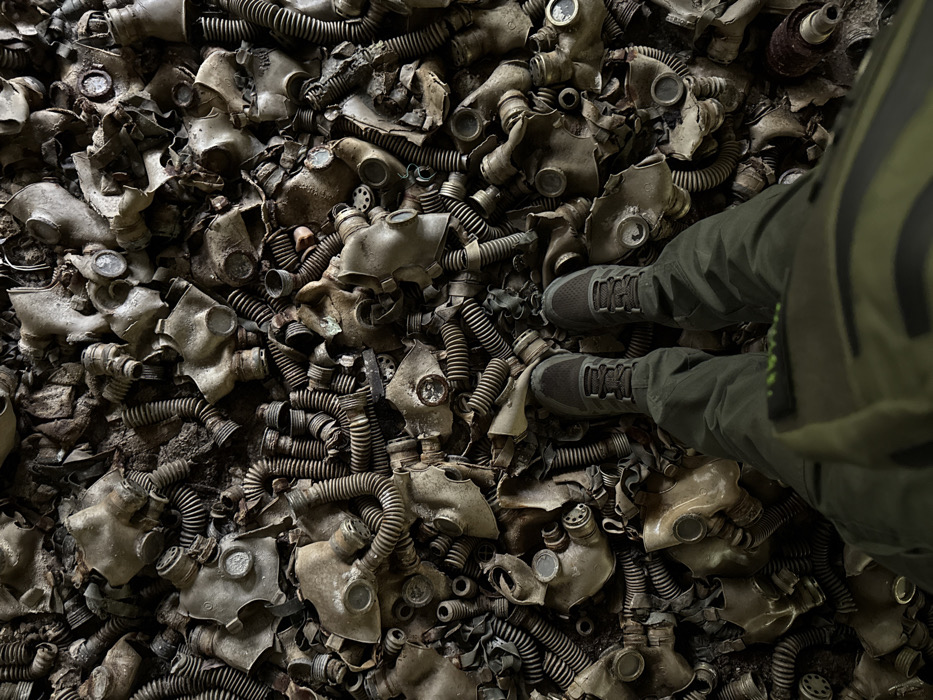 - "The image displays an overhead, first-person perspective of a dense accumulation of decaying Soviet-era GP-5 gas masks and their associated corrugated rubber hoses, located in School No" by FM-HJIgS2, licensed under CC BY 4.0