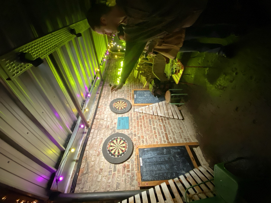 A person throws a dart towards a dartboard on a brick wall. Two dartboards and two chalkboards for scoring are visible. A xylophone leans against the wall. Green and purple string lights illuminate a metal wall. A second person is partially visible in the background. The scene appears to be in a dimly lit bar or recreation area.