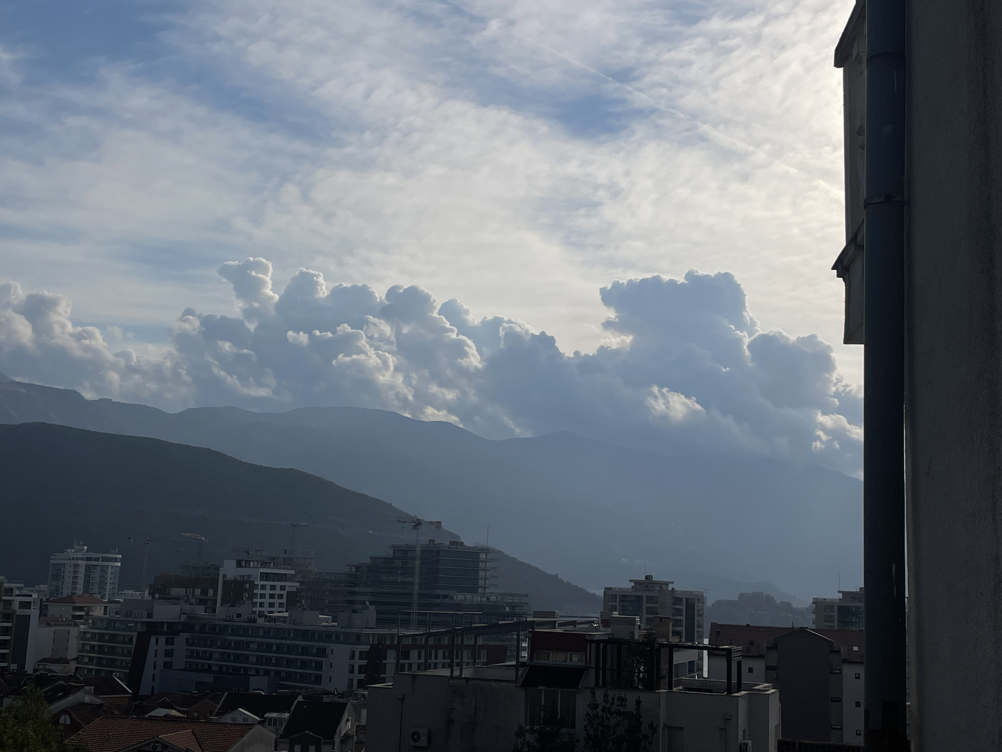 The image displays an expansive view of Budva, Montenegro, observed from an elevated position, likely from a building. The upper portion of the frame features a blue sky with scattered cirrus and altocumulus clouds, including a visible contrail. Below this, a prominent formation of brightly lit cumulus clouds rises above a distant mountain range, which appears dark and hazy. The urban landscape of Budva fills the mid-ground and foreground. It is characterized by a dense arrangement of multi-story buildings, many appearing modern with light-colored facades, flat roofs, and numerous balconies. Several construction sites are evident, identified by partially completed structures and at least two visible tower cranes. Older buildings with red-tiled roofs are interspersed among the newer constructions. On the far right of the image, a dark gray section of a building, including a vertical downspout or utility pipe, partially frames the scene, indicating the point of observation. No individuals, explicit actions, or interactions are depicted within the frame. The scene presents a static overview of a developing city nestled against mountainous terrain, under conditions of partial cloud cover and backlighting from the right.
