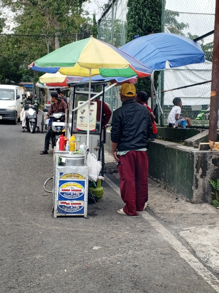 This image captures a daytime street scene centered around a food vendor. In the foreground, slightly left of center, a metal street food cart is positioned on the asphalt pavement. The cart features a colorful, segmented umbrella with yellow, green, blue, and red panels. On the cart's counter, a metal steamer pot, red ketchup, yellow mustard, and a white plastic bottle of sauce are visible. The lower section of the cart displays blue and white signs with text, including "BATAGOR" and "SIOMAY BANDUNG," indicating Indonesian street food items. A small green LPG cylinder rests on the ground next to the cart. To the right of the cart, a male individual stands with his back mostly to the camera, wearing a yellow baseball cap, a dark jacket, loose red pants, and white shoes. Partially obscured behind the cart, another person in a dark red shirt appears to be operating the vendor stand. On the paved road to the left, traffic is present. A white van is visible in the background, followed by a person on a dark scooter wearing a helmet, with a passenger behind them. Closer to the foreground, a person in a dark brown shirt and cap is seated on a scooter, facing left. In the mid-ground, on the right side of the image, a concrete ledge or wall runs parallel to the road. Two small, dark containers are placed on this ledge. Behind the ledge, a chain-link fence separates the street from an area with lush green foliage and trees. Two individuals are seated on the concrete ledge behind the fence; one wears a white patterned t-shirt. An orange cat is also visible on the concrete ledge to the far right. The sky is overcast. Based on the explicit mention of "BATAGOR" and "SIOMAY BANDUNG" on the vendor cart, which are well-known Indonesian street foods originating from Bandung, Indonesia, the visual evidence strongly indicates the scene is located in Indonesia or another part of Southeast Asia, not Chennai, India.