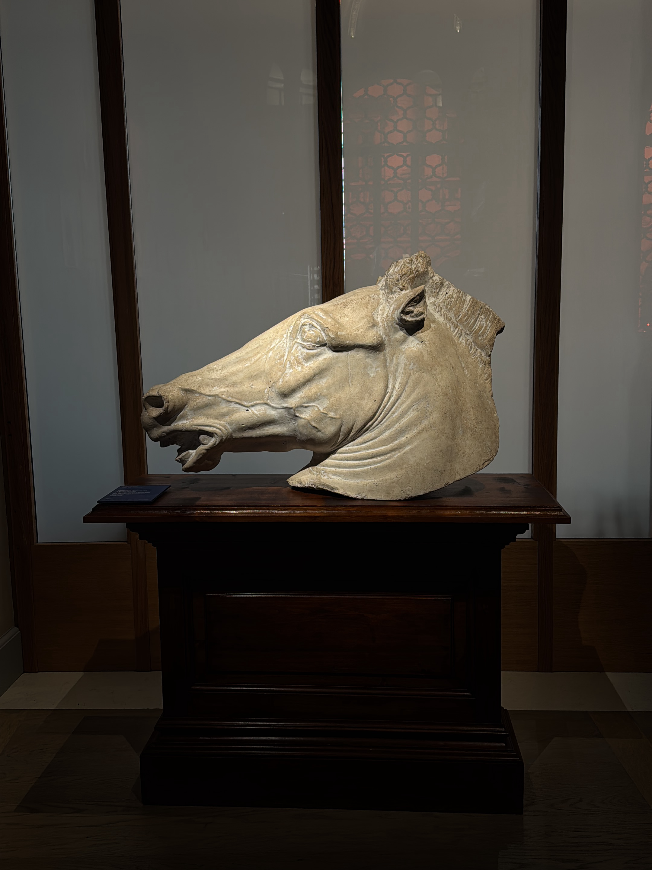 An indoor scene within a museum or gallery setting. The primary subject is a large, light-colored stone sculpture of a horse's head, depicted in profile and facing left. The sculpture exhibits detailed musculature, prominent veins, an open mouth with visible teeth, and textured mane, suggesting a powerful or dynamic representation. It is made of weathered marble or a similar light-colored stone. The sculpture rests on a dark brown wooden pedestal or cabinet, rectangular in form, featuring a flat top surface and paneled details on its body. A small, dark blue, rectangular object, possibly a mat or coaster, is positioned on the left side of the pedestal's top, adjacent to the horse's muzzle. In the background, a wall composed of vertical, light-colored translucent panels framed in dark wood is visible. Through the upper right section of these panels, an illuminated, repeating geometric pattern in a reddish-orange hue is discernible, suggesting an ornate window or decorative screen behind the panels. The scene is moderately lit, with shadows present in the foreground and lower sections of the pedestal. No individuals are present, and no actions or interactions are depicted. This scene is located within the Civiche Raccolte d'Arte Antica (Civic Collections of Ancient Art) at the Castello Sforzesco, Milano, Italy.
