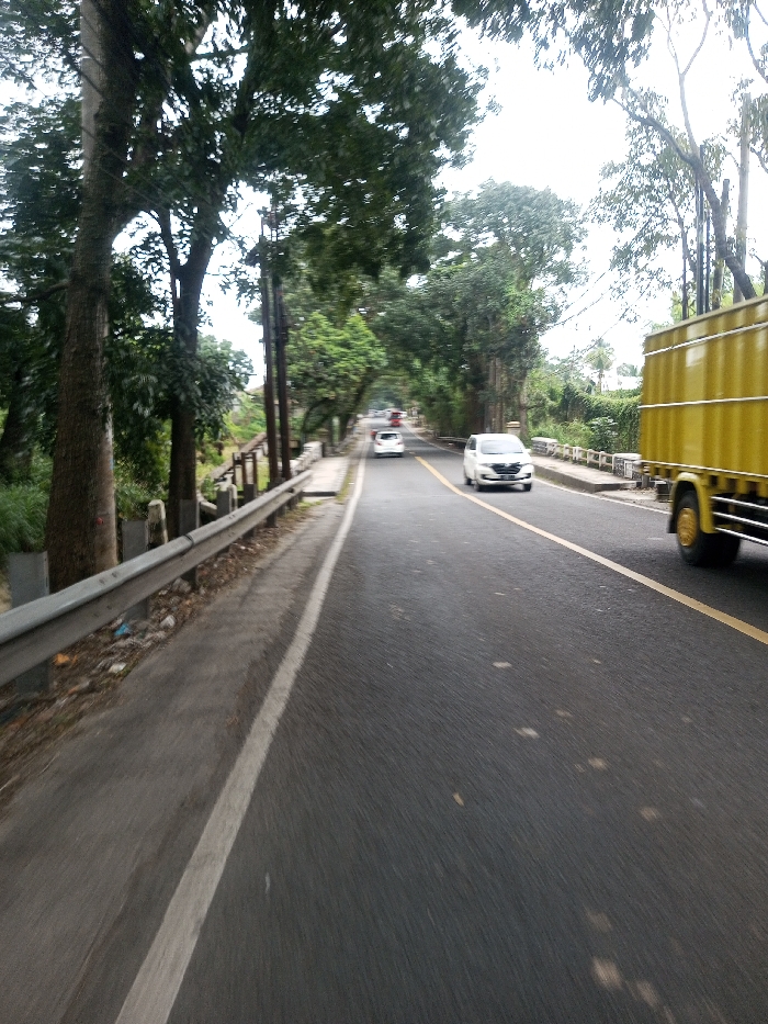 The image captures a two-lane asphalt road in Khajuripada, India, from a low-angle perspective suggesting forward motion. A metal guardrail parallels the left edge of the road, behind which are tall trees, dense green vegetation, and multiple utility poles. A solid white line marks the immediate left edge of the road, while a solid yellow center line with an adjacent white dashed line separates the lanes. A large yellow box truck is partially visible in the right foreground, occupying the right lane and moving towards the viewer. A white sedan travels in the left lane, moving away from the viewer in the midground, with another white vehicle visible further in the background. Stone bridge barriers are present on the right side of the road, bordered by additional green foliage and trees. The sky is overcast. No individuals are visible.