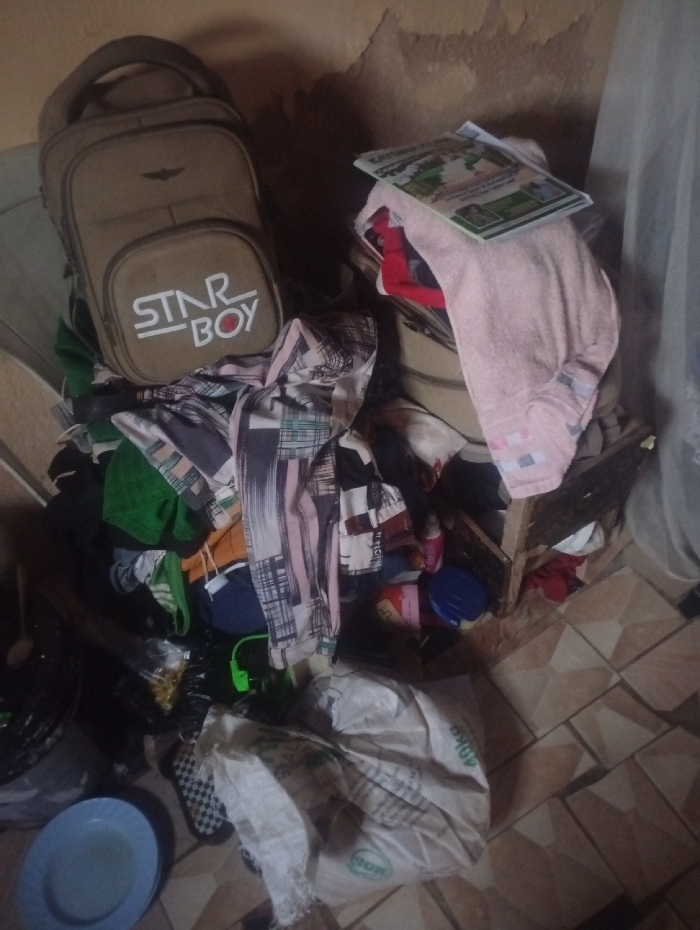 A cluttered scene features a beige backpack with "STAR BOY" printed on its front, resting atop a pile of mixed clothing. A book sits on the clothing pile which rests on a weathered wooden stool. A large white bag marked with "40kg" lies nearby, near a blue plate and other items. The composition suggests a room in disarray, with objects casually stacked and scattered. The wall shows signs of wear and tear.