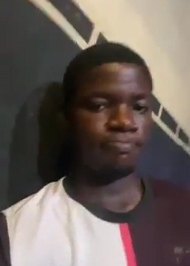 A young dark-skinned man with short, dark hair stands indoors. He is wearing a white and dark maroon t-shirt with a red stripe on the white side. The man is facing the camera with a slightly serious expression. The background consists of a wall with a tan or beige upper section and a dark stripe below, with some darker markings. The camera is unsteady, suggesting it's being handheld. There is music playing in the background.