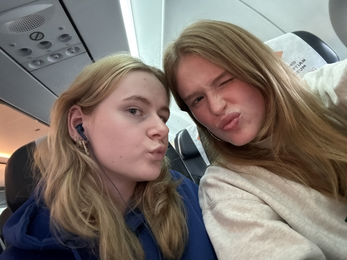 Two young females are depicted inside a commercial aircraft cabin, located in the city of Schiphol, Netherlands