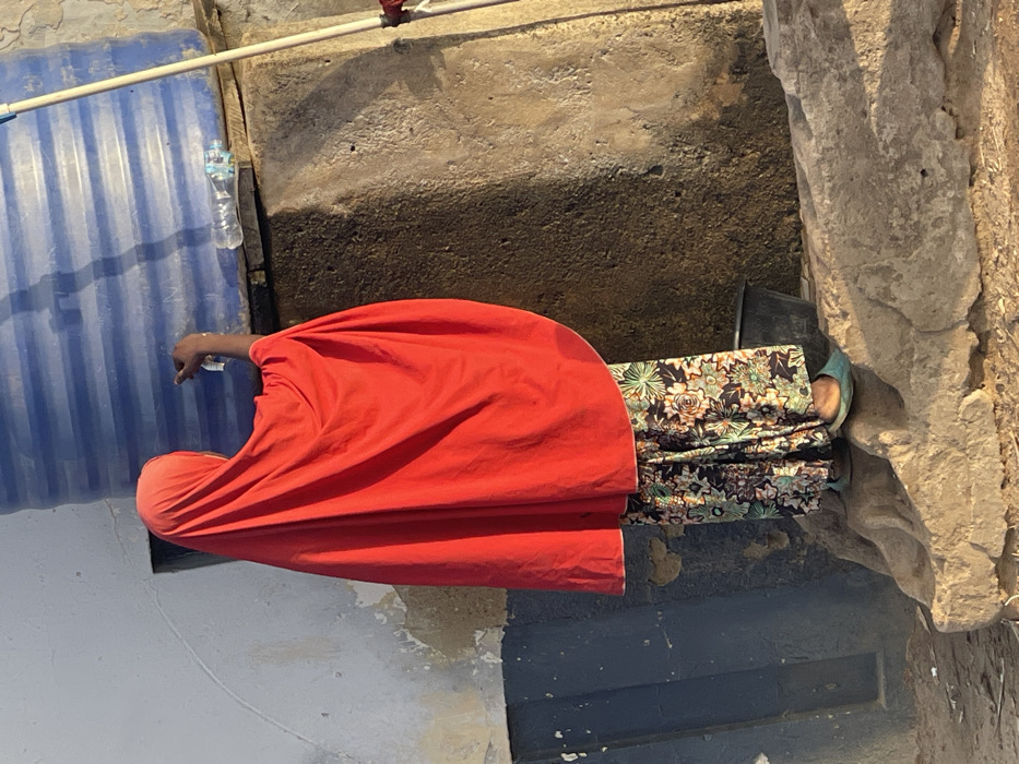 An individual, viewed from behind, stands facing a large blue corrugated plastic water tank situated on an elevated, rough concrete or stone platform. The person is dressed in a vibrant, flowing red head covering (possibly a khimar or hijab) and a dark patterned lower garment featuring floral or abstract designs in greens, oranges, and whites. Light blue flat footwear is visible. The right arm is extended, and the individual appears to be manipulating a small, clear plastic item (possibly a sachet or small bottle) at a tap or dispenser on the side of the blue tank. An empty, clear plastic water bottle lies horizontally on the platform next to the tap. A black bucket rests on the ground behind the person's feet. To the right, a white pipe with a red fitting runs vertically. The immediate environment includes a light-colored, weathered wall on the left and the dark, textured concrete wall supporting the tank on the right. The ground is composed of rough concrete steps or natural rock formations. The scene is illuminated by direct sunlight, casting distinct shadows. This activity occurs in the city of Muchiya, Nigeria.