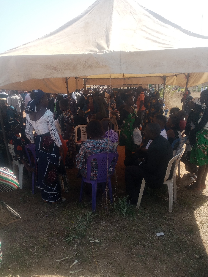Under a large, light-colored canvas tent, a gathering of approximately 50-70 individuals, primarily Black adults, is observed in Gwafan, Nigeria