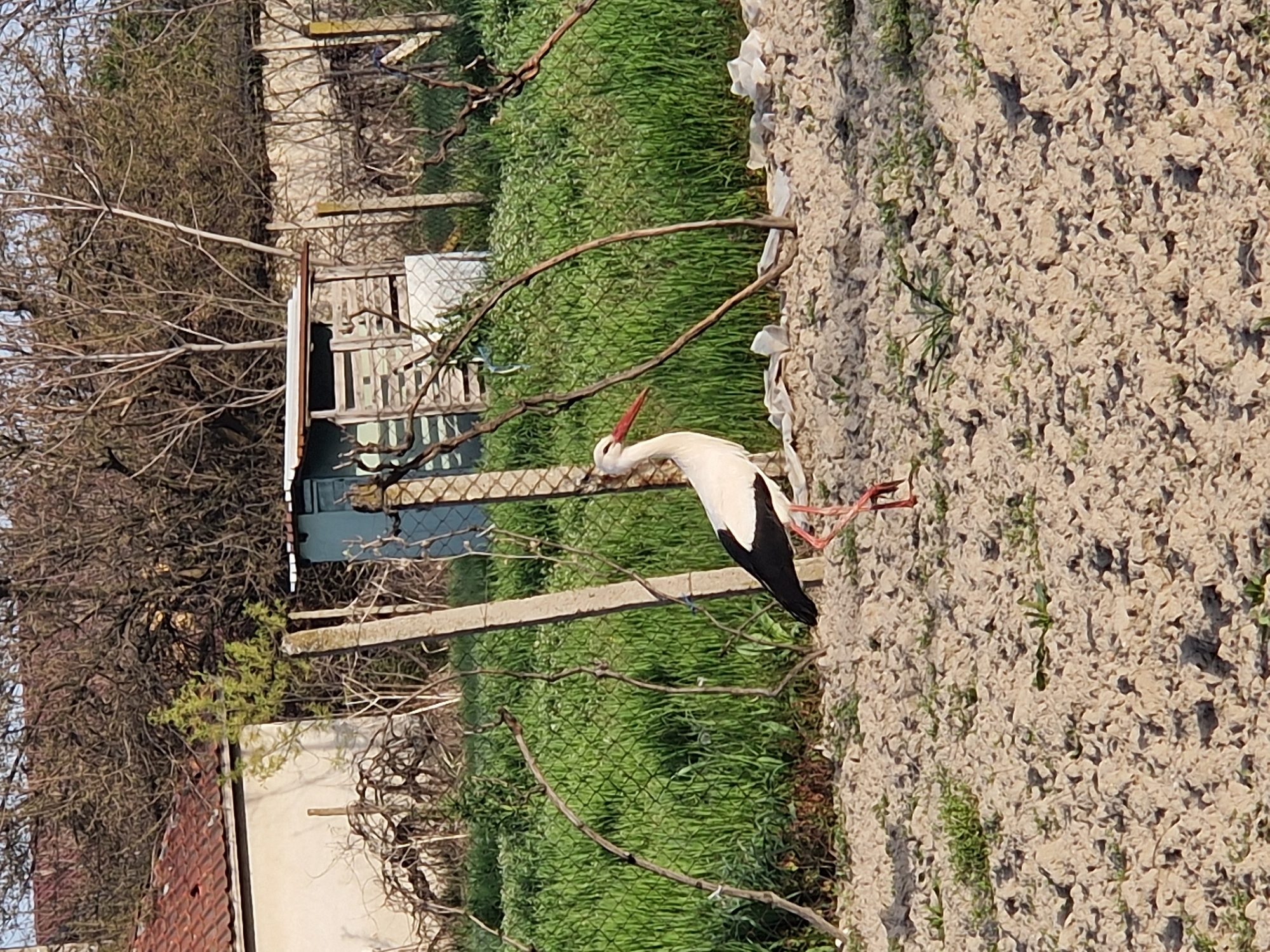A tilted eye-level shot shows a white stork with black markings, standing on its two red legs in a sandy field with sparse green vegetation. The stork has a long, red beak and is oriented towards the center-left. Behind the stork, there's a green grassy area with some bare branches. Further back, there is a dilapidated wooden structure with a blue door, partially obscured by vegetation and a fence. A brick building is visible in the lower left corner, with trees in the background. The image suggests a rural setting, and the presence of the stork indicates a location in or near a natural habitat. The location is Rogosh, Bulgaria.
