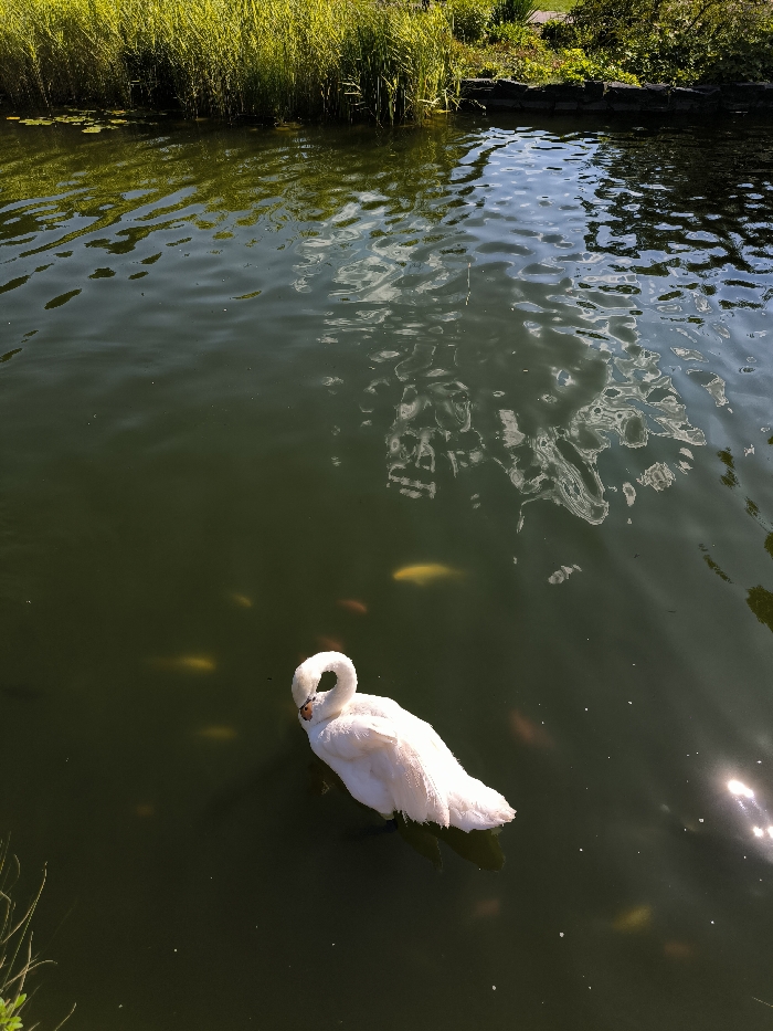 The image depicts an outdoor scene at a pond or lake in Novi Petrivtsi, Ukraine. A single white swan is centered in the lower portion of the frame, floating on the dark green water with its head bent down towards its back. Submerged beneath the water's surface, several orange and yellow fish are visible. The water displays ripples and reflections of the sky, along with shimmering sunlight in the lower right. The upper section of the image shows the shoreline, characterized by a dense growth of tall, light green reeds or grasses. Behind the reeds, darker green foliage and a low, dark-colored structure, possibly stone or concrete, are present.