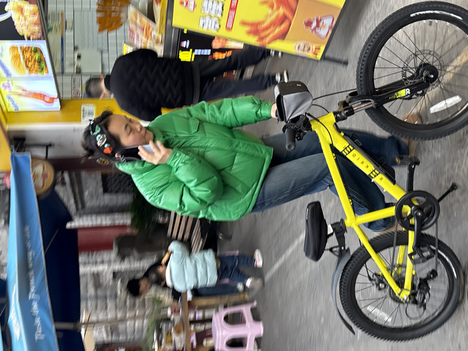This image depicts a street scene in Banan, China, featuring a woman walking a bicycle in the foreground. The central figure is an adult East Asian female, dressed in a vibrant green puffer jacket and blue jeans, with light-colored shoes. She wears a headband adorned with colorful, possibly floral, decorative elements. She is holding a light-colored smartphone to her right ear, engaged in a call, while her right hand grips the handlebar of a bright yellow mountain bicycle. The bicycle, branded "ROCKRIDE" on its frame, features a black seat with an attached black saddlebag, black fenders over both wheels, disc brakes, and a deployed kickstand. To the left, an outdoor dining area is visible under a partially seen blue umbrella. A wooden table with beverages and a pink plastic stool are present. An adult in dark clothing and a child in a light blue puffer jacket and dark pants are partially visible; the child appears to be holding food to their mouth. Behind them, blurred stone or brick buildings, a dark red wall section, and a stone sculpture resembling a lion are discernible. To the right, a storefront with a prominent yellow facade displays various food items, including burgers, fries, and pizza. A male figure in a black puffer jacket and dark pants stands near this storefront. A yellow A-frame sign with an image of french fries and Chinese characters stands on the pavement, alongside a smaller sign featuring a burger. The ground is a paved surface, and the overall scene suggests a busy commercial or pedestrian area. Motion blur is evident on some background figures and elements, indicating movement.