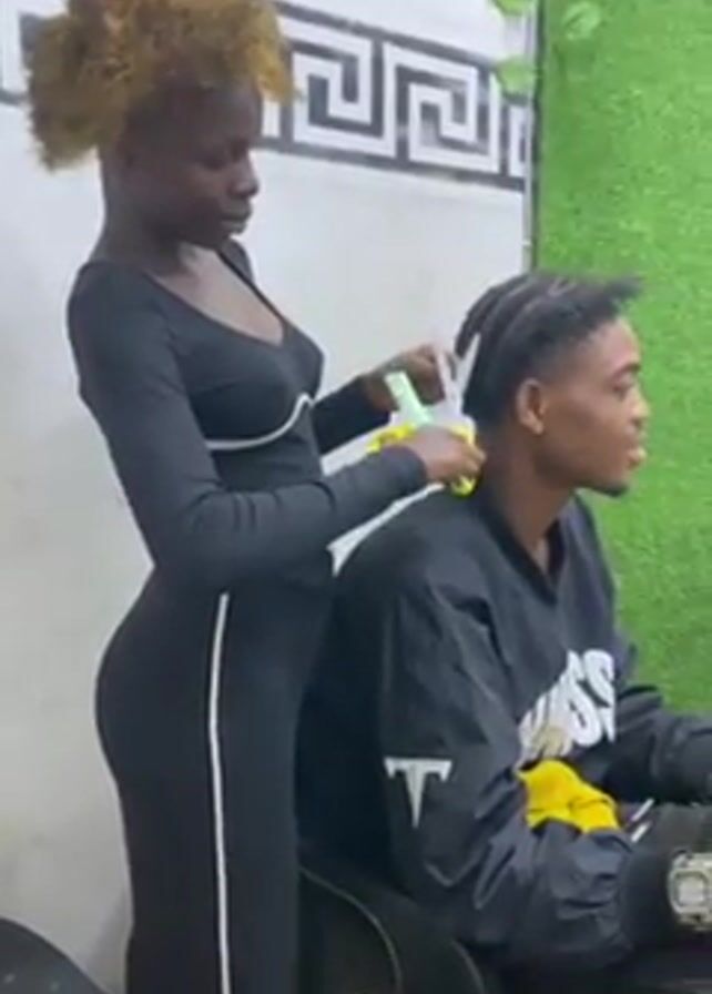 A young woman with short, curly, light-brown hair is shown cutting a young man's hair with scissors. The woman is wearing a black, long-sleeved bodysuit with white trim. The man is sitting down and has his hair in cornrows, and is wearing a black jacket with a white "T" logo and yellow sleeves. The background includes a white and gray decorative wall and a faux green plant.