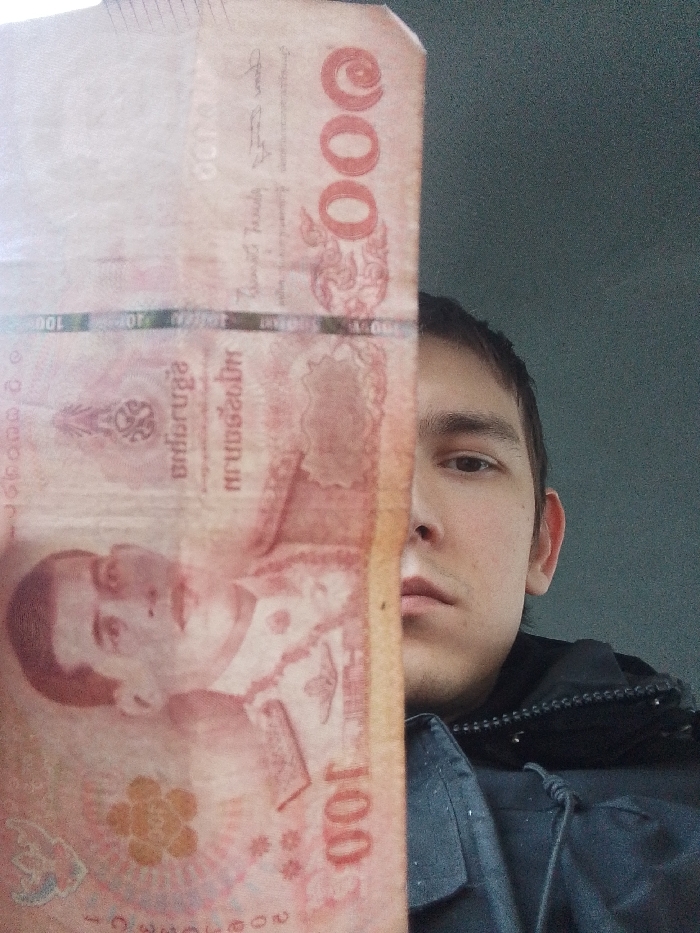 - "A young adult male is visible in a close-up, low-angle shot, with the left half of his face obscured by a vertically held 100 Thai Baht banknote" by FM-mibk92, licensed under CC BY 4.0