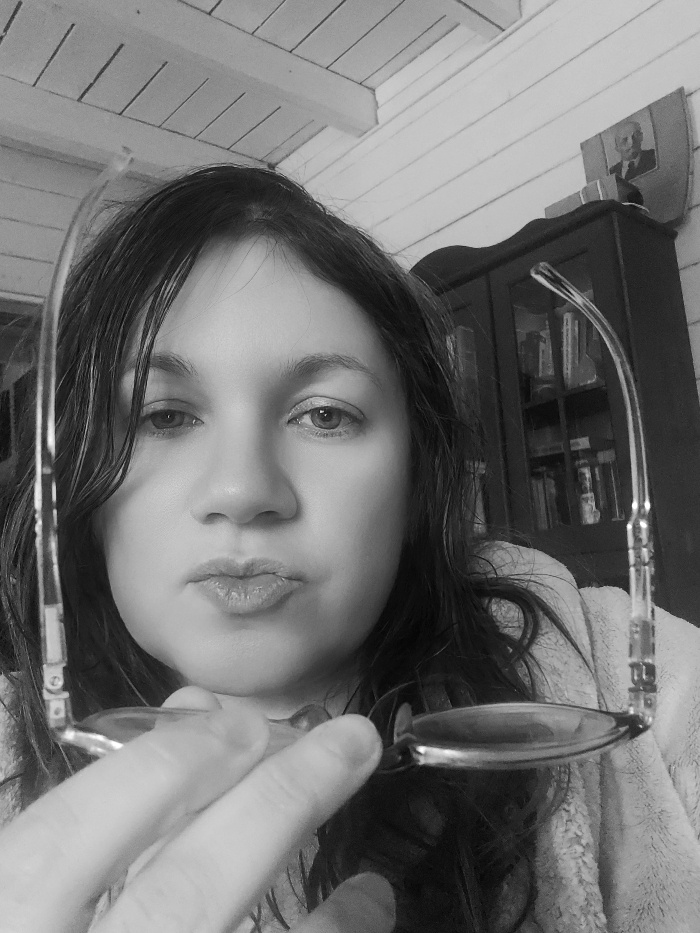 A black and white photograph depicts an adult female positioned centrally, looking directly at the camera. Her dark, shoulder-length hair is visible around her face. Her lips are pursed. Her left hand (viewer's right) holds a pair of eyeglasses with clear frames in the foreground, partially obscuring the lower portion of her face. She wears a light-colored, textured garment on her right shoulder (viewer's left), possibly a bathrobe. The background on the left features a light-colored, horizontally paneled wooden wall or ceiling with a visible beam. On the right, a dark wooden cabinet with glass doors and shelves containing books is visible. Above the cabinet, a framed portrait of a bald man, possibly Vladimir Lenin, is mounted on a light-colored, shield-shaped plaque on the wall. The scene is indoors in the city of Свистуха (кузяевский С/о), Russia.
