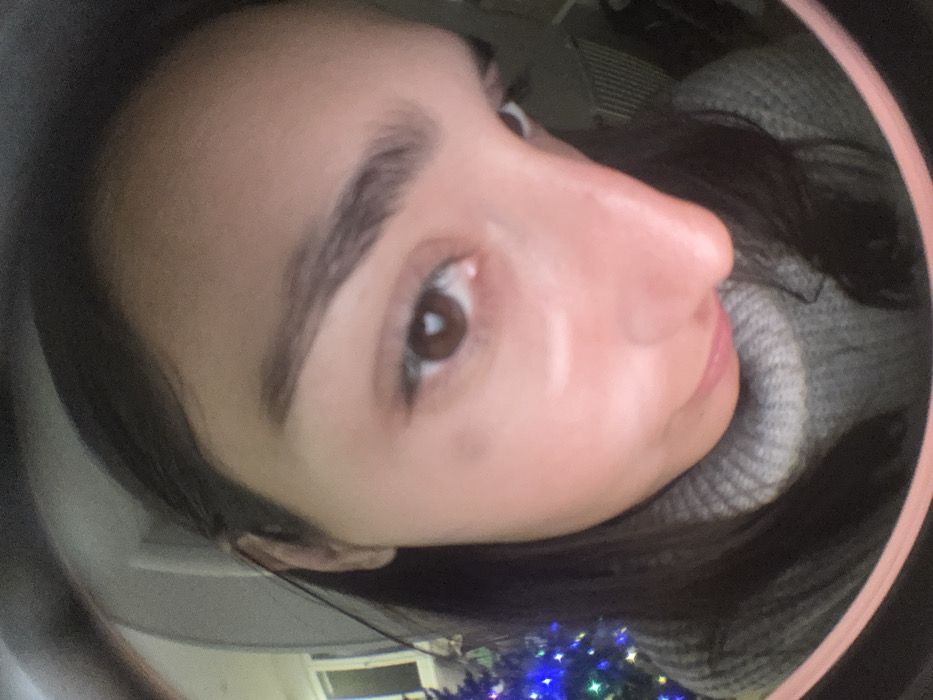 A close-up, angled shot of a woman's face, partially framed within a round object with a light pink rim. Her right eye is prominent, with dark brown iris and defined eyebrow. She has a mole on her right cheek. She wears a grey, possibly knitted, turtleneck sweater. The background hints at a room interior, with a glimpse of what appears to be a Christmas tree with blue lights and a window. The image has a fisheye lens effect, creating a distorted perspective.
