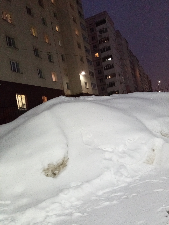 A large snowdrift dominates the foreground, exhibiting a mix of pristine white snow and patches of dirt. Behind the snowdrift, several tall apartment buildings rise into the twilight sky. The buildings vary in color from light gray to darker tones, their windows illuminated by the faint glow of artificial lights. The overall scene conveys a wintry urban landscape at dusk or night.