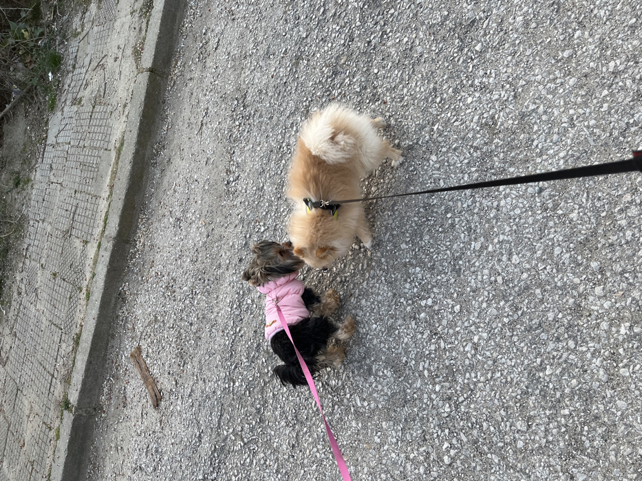 In the city of Damianitsa, Bulgaria, two leashed small-breed dogs are observed interacting on a light grey gravel surface. To the left, a Yorkshire Terrier, dark brown and black with tan markings, wears a pink padded jacket and is attached to a pink leash extending out of frame. It faces right, positioned nose-to-nose with the second dog. To the right, a fluffy tan-colored Pomeranian wears a dark harness with a yellow-green accent and is attached to a black leash extending downward out of frame. It faces left, also nose-to-nose with the first dog. The background features a concrete curb separating the gravel from a concrete sidewalk, which exhibits a grid-like patterned texture. Sparse vegetation and a small piece of brown wood are visible on the ground near the curb. The scene is illuminated by natural daylight.