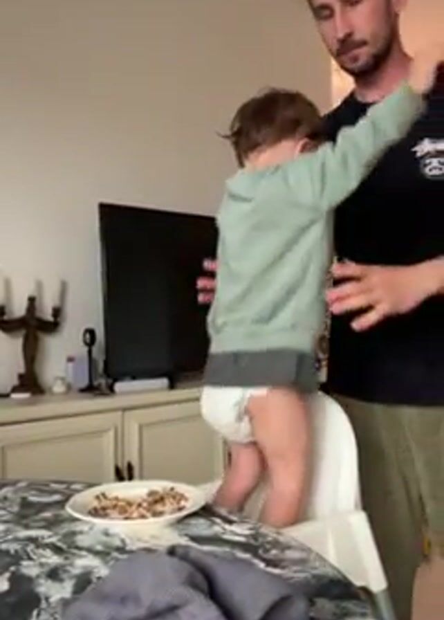 A father is seen holding a toddler in a diaper up off of a high chair in what appears to be a home setting. The father then puts the toddler down on the floor near a small table and the toddler raises both arms in the air. There is a plate of food sitting on a table nearby, a TV, a cabinet and other household items present in the video. The father is wearing a black t-shirt and green pants. The toddler is wearing a green sweater, grey shorts, a diaper, and tan boots.