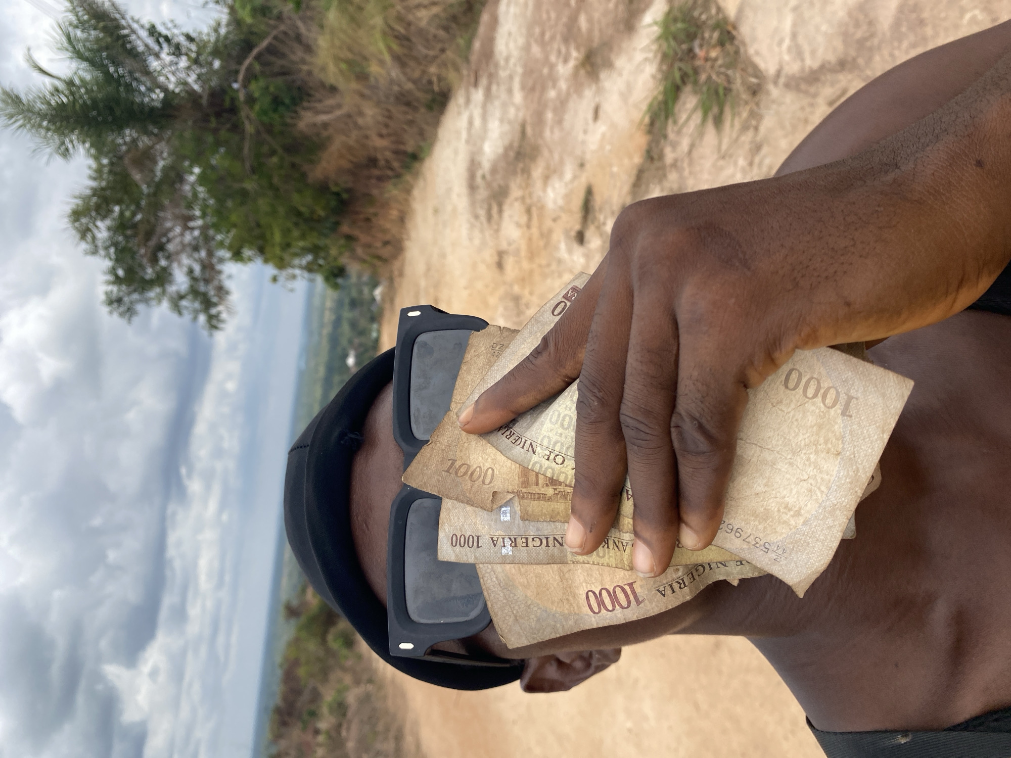 An outdoor, eye-level close-up photograph captures a dark-skinned individual on an unpaved dirt path in Nguzu Edda, Nigeria. The individual is depicted from the chest up, wearing a black fabric cap and black-framed rectangular sunglasses. Their right hand holds and fans out multiple worn 1000 Nigerian Naira banknotes, intentionally obscuring the lower half of their face. The visible skin on the neck and shoulder area indicates a dark complexion, and a dark-colored garment is partially visible. The immediate environment consists of a light brown, uneven dirt path with patches of dry grass and small plants on its edges. Beyond the path, the background reveals a sloping, vegetated landscape with distant trees and faint structures under a cloudy, overcast sky.