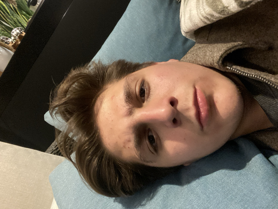 A young man with brown hair reclines on a blue pillow. He wears a brown jacket zipped up. His face is close to the camera, with dark eyes and a slightly furrowed brow. A plant and decorative objects are visible in the top left corner on a black surface, which appears to be a cabinet or shelf. A light-colored surface is visible in the lower left corner.