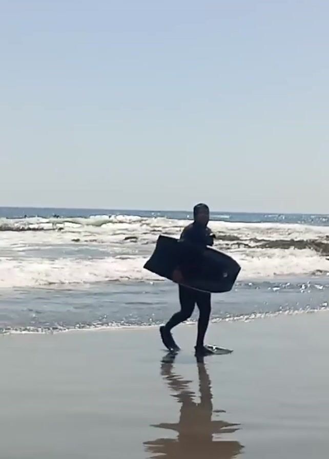 - "The video opens with a person in a black wetsuit and swim fins, carrying a black bodyboard walking along a wet sandy beach towards the ocean" by FM-pGTMm2, licensed under CC BY 4.0
