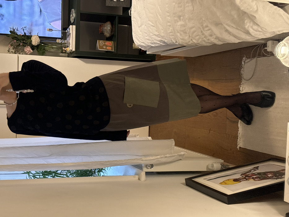 The image depicts a mirror reflection of a person standing in an indoor residential setting within the city of London, United Kingdom. The individual is dressed in a dark navy long-sleeved top with a subtle circular pattern, a two-toned skirt (brown-grey upper, olive green lower) featuring a prominent olive green patch pocket with a light button, sheer black polka-dotted tights, and black split-toe flat shoes. A silver-toned necklace with multiple dangling elements is visible around the neck. The person's raised right hand holds a mobile phone, indicating the act of capturing a self-portrait. The background reveals a room with wooden flooring partially covered by a light-colored rug. To the left, a framed artwork depicting a stylized figure with a yellow head, red torso, and brown lower body rests against a plain light-colored wall. A window with white curtains and a white radiator below it is visible, with green foliage discernible beyond the glass. To the right, a dark green shelving unit displays a glass vase holding pink and red flowers, various small decorative objects, and a television screen showing part of a man's face. A lower shelf contains a small framed picture or card and a reddish-brown ceramic pot. A white bed with a textured white duvet is partially visible on the far right, alongside a glass lamp and a white power strip on the floor.