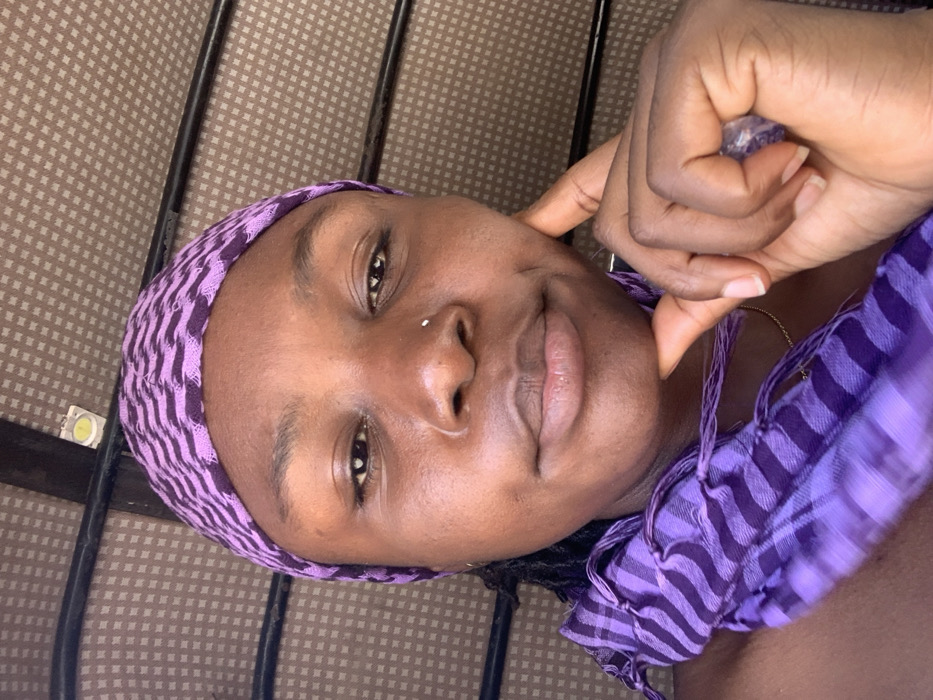 A dark-skinned individual is depicted in a close-up, head-and-shoulders portrait, centered in the frame
