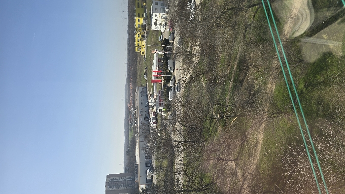 This image presents an elevated, broad view over an area within Pleven, Bulgaria, under a clear, bright blue sky. In the immediate foreground, two parallel, slightly angled green cables or hoses are visible, along with reflections in the bottom right corner. Below these, a landscape of bare-branched trees, consistent with late winter or early spring, extends over patches of green grass and visible dirt paths. The midground features a thoroughfare with vehicular traffic. Numerous white commercial vans and several cars are present, indicating commercial activity. To the left of the road, a large, rectangular white building, resembling a warehouse or distribution center, is prominent with multiple loading docks. Adjacent to the road and to its right, a gas station with a canopy and several red flags is visible. Further right, a distinct bright yellow commercial building stands out, along with other smaller white buildings. In the background, a tall, multi-story residential building dominates the far left horizon. Beyond the commercial structures, the landscape transitions into open, somewhat undeveloped fields with sparse vegetation, leading to a distant tree line or low hills on the horizon. The scene is illuminated by strong sunlight, casting visible shadows. No specific individuals are distinctly identifiable, but the presence of vehicles and commercial facilities implies human activity.